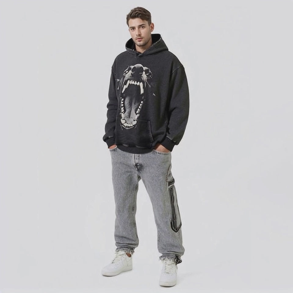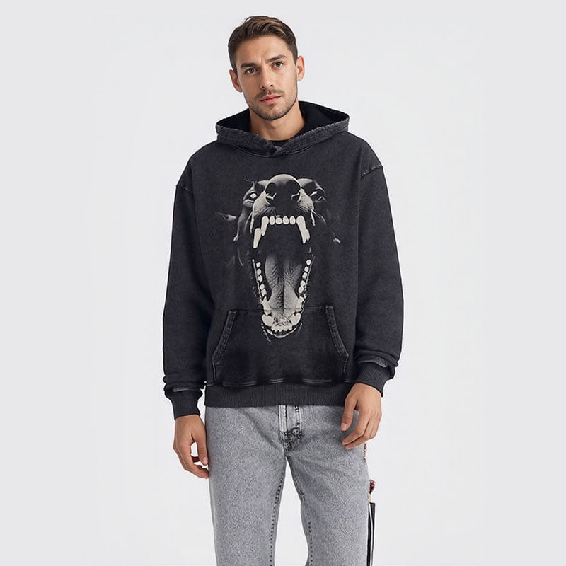 Doberman print heavyweight washed distressed hooded sweatshirt men's long-sleeved hoodie