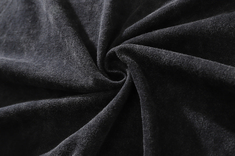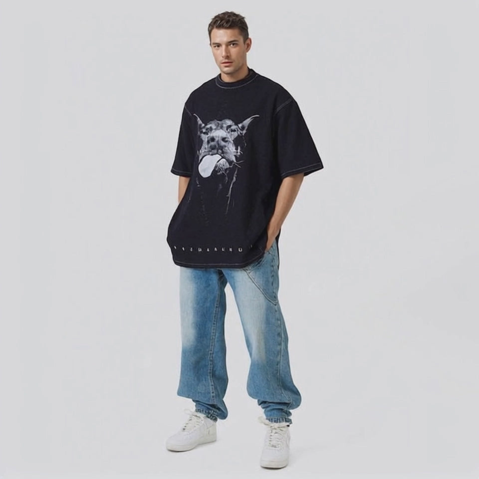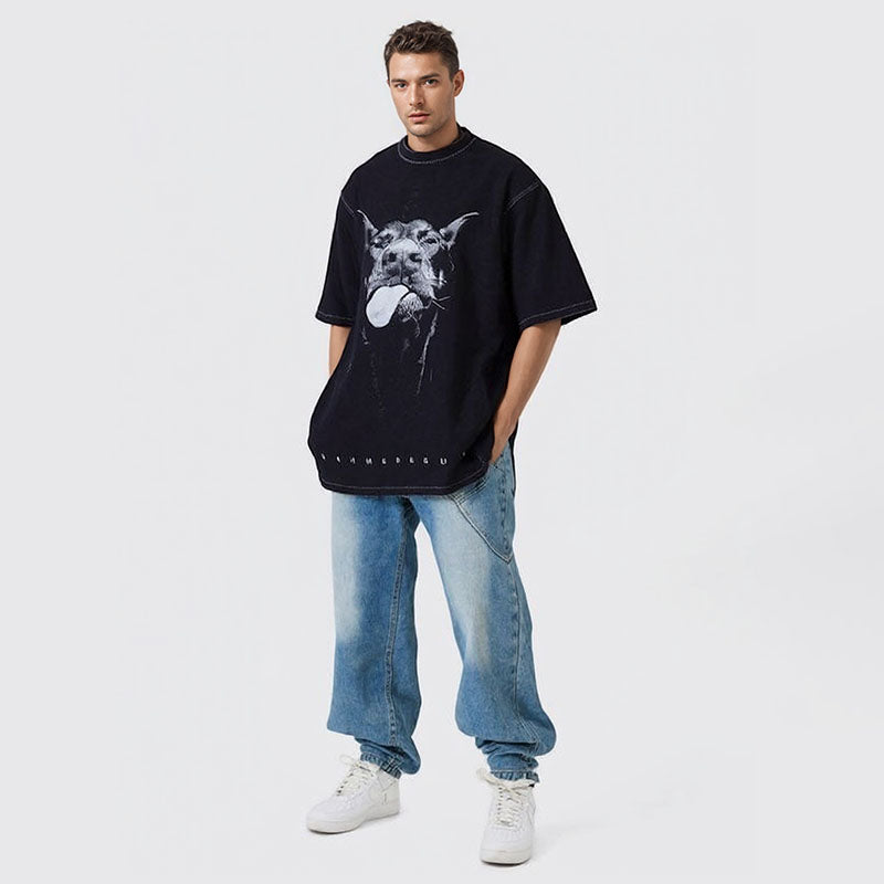 Doberman print washed retro high street popular round neck short-sleeved T-shirt for men and women street