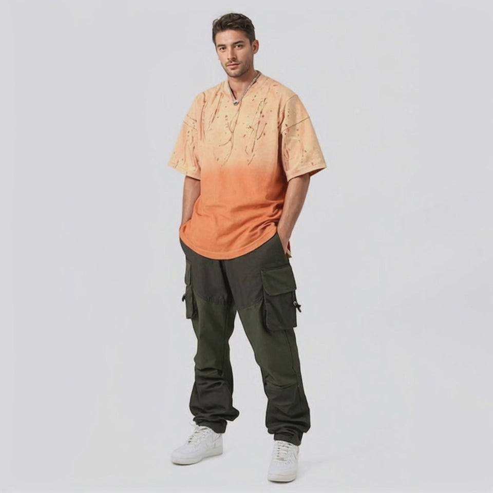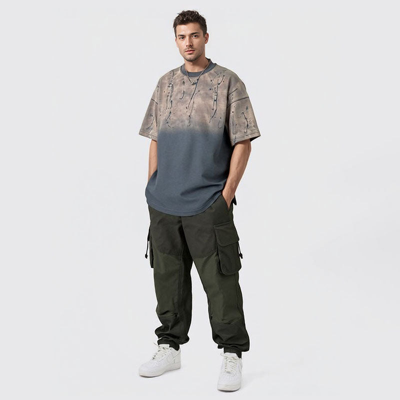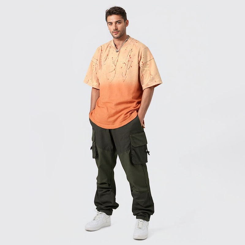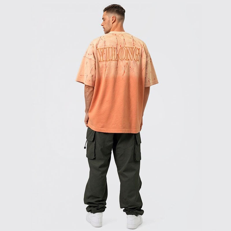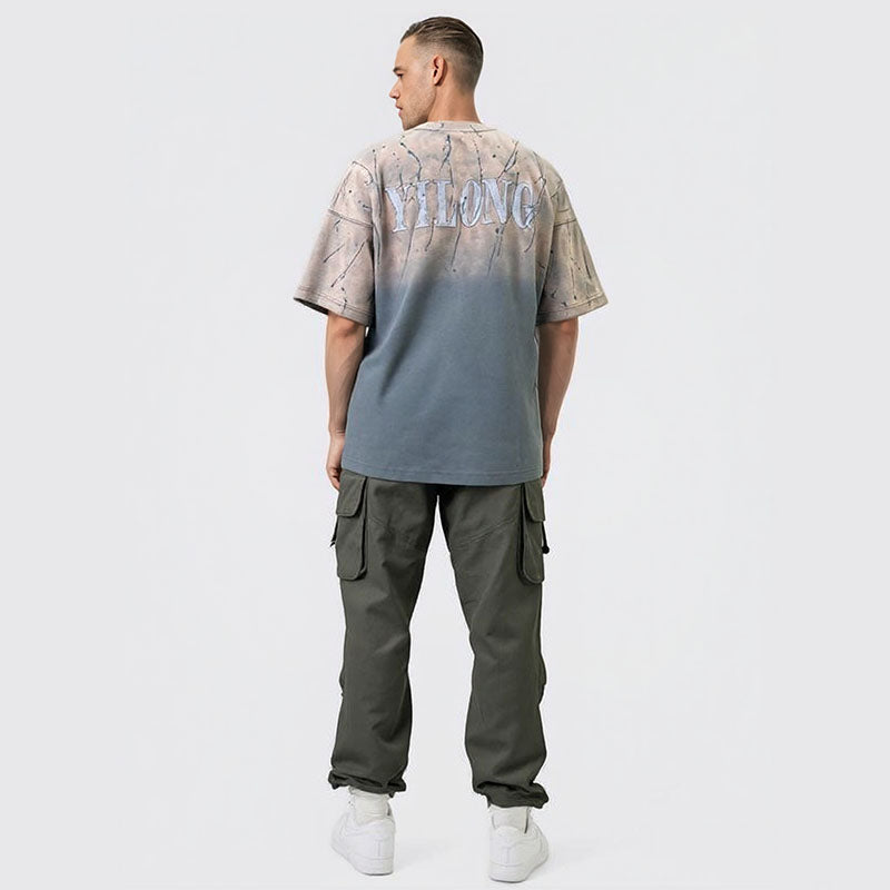 Gradient wash fabric applique embroidery short sleeve T-shirt for men