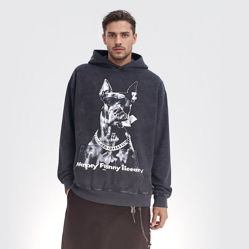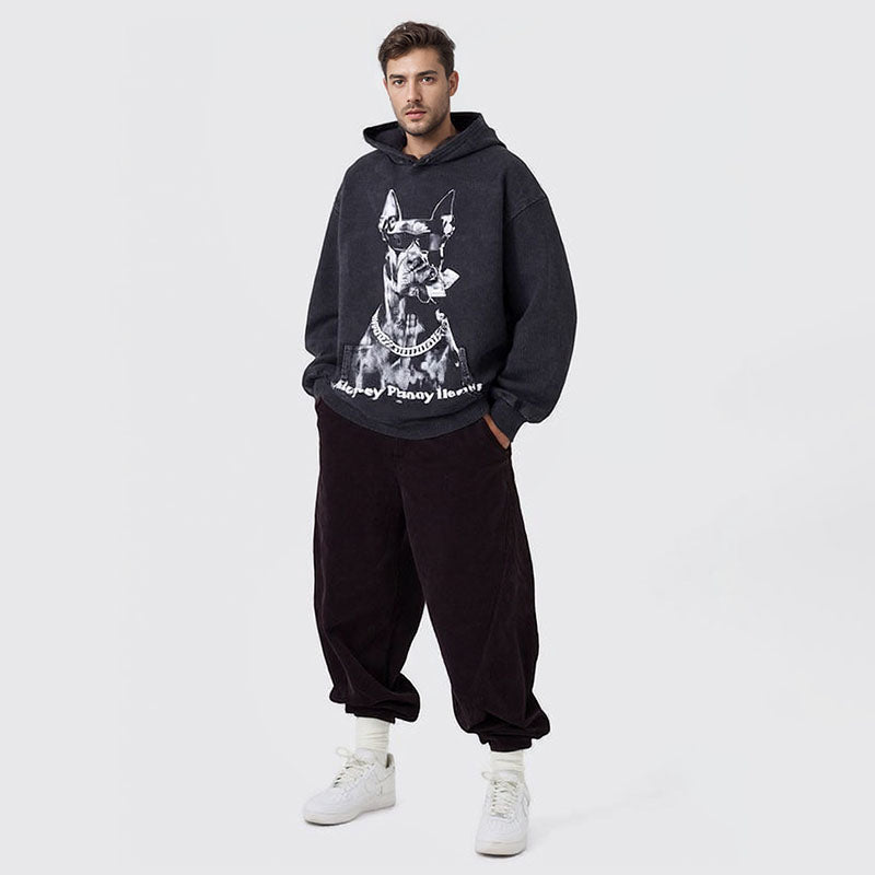 High Street Retro Sweatshirt Washed Doberman Print Hoodie Hip Hop Couple Tops Unisex