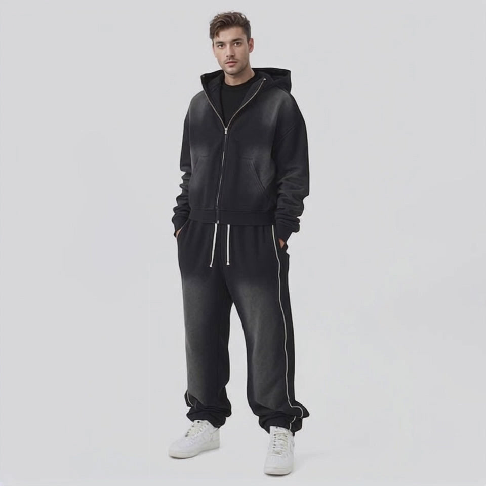 Men's loose short style spray-on zipper sweatshirt high quality heavyweight 100% cotton distressed washed sweatshirt