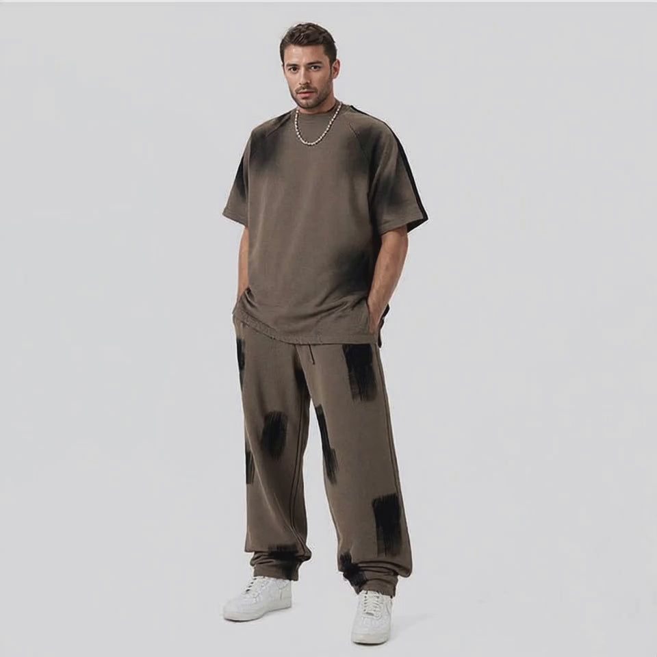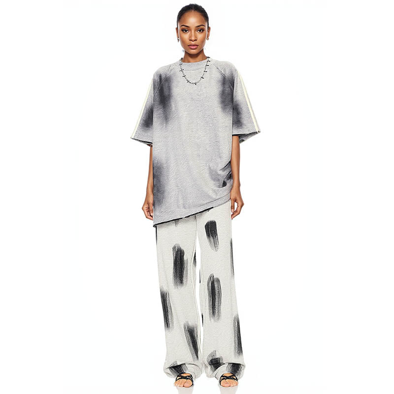 Unleash your youthful spirit with our men's spring and summer spray color frayed tops. Made with comfortable cotton, this oversized shirt features a round neck and short sleeves. Crafted with a unique spray color technique and frayed edges, this shirt is perfect for a stylish and carefree summer.