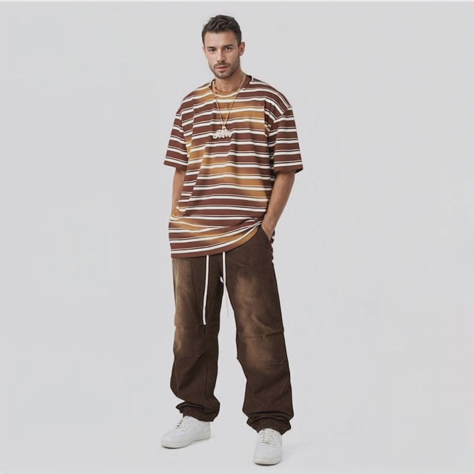 Indulge in luxury with our men's spring/summer T-shirt. Made with pure cotton, this T-shirt features a wash gradient design, striped color contrast, and a round neck for a touch of sophistication. Perfect for the streets, this short-sleeved tee is the ultimate blend of style and comfort.
