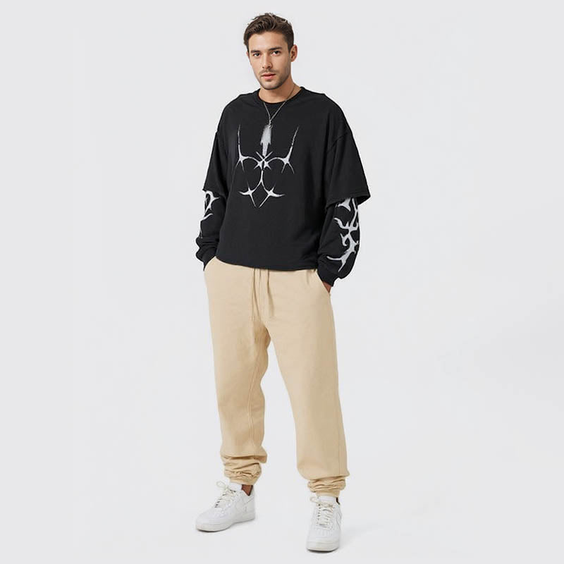 New Spring and Autumn Printed Round Neck Long Sleeve T-Shirt Men's Retro Washed Fake Two-Piece Loose Men's Long T-Shirt