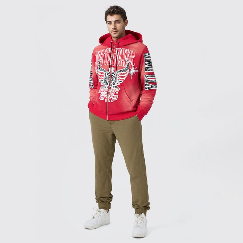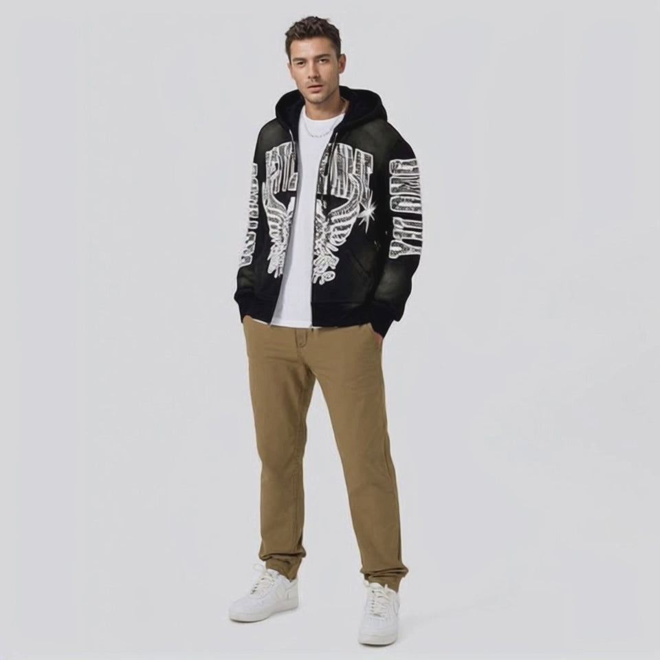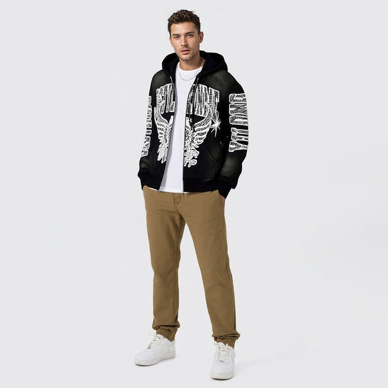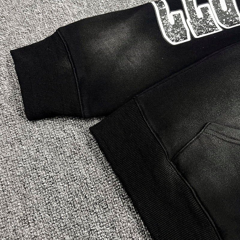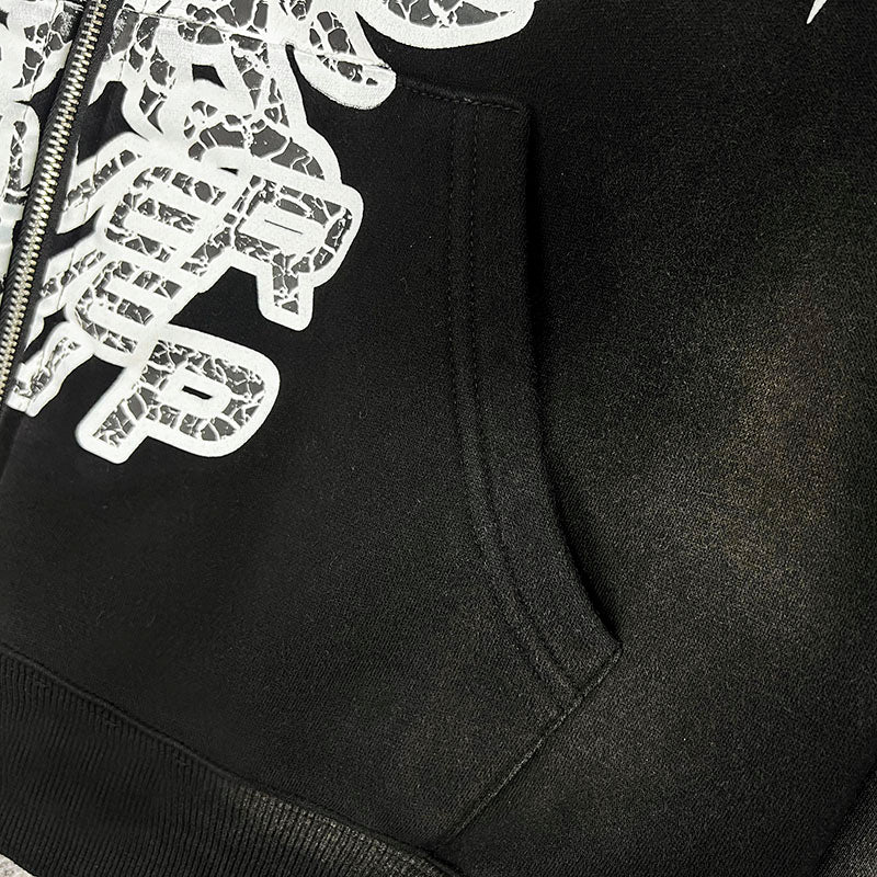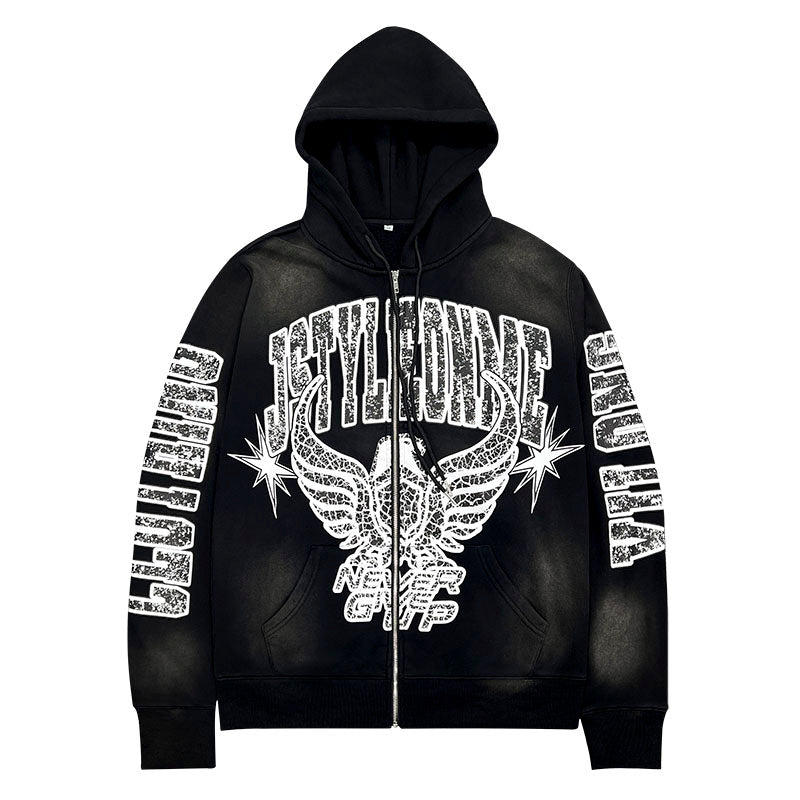 Plush autumn and winter style cracked print acid-washed zipper hooded sweatshirt
