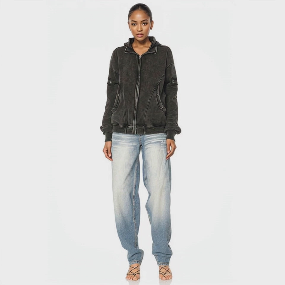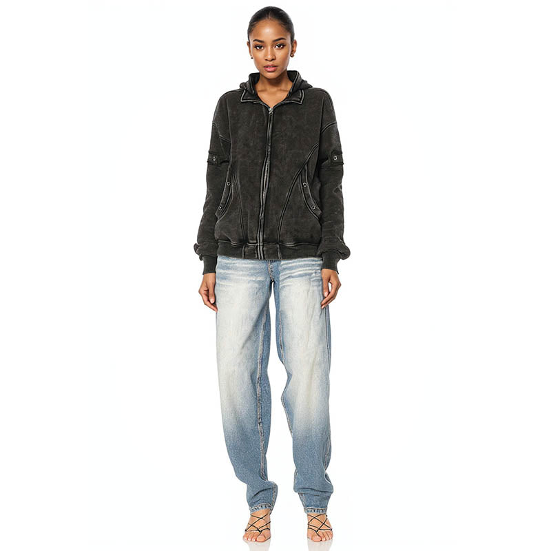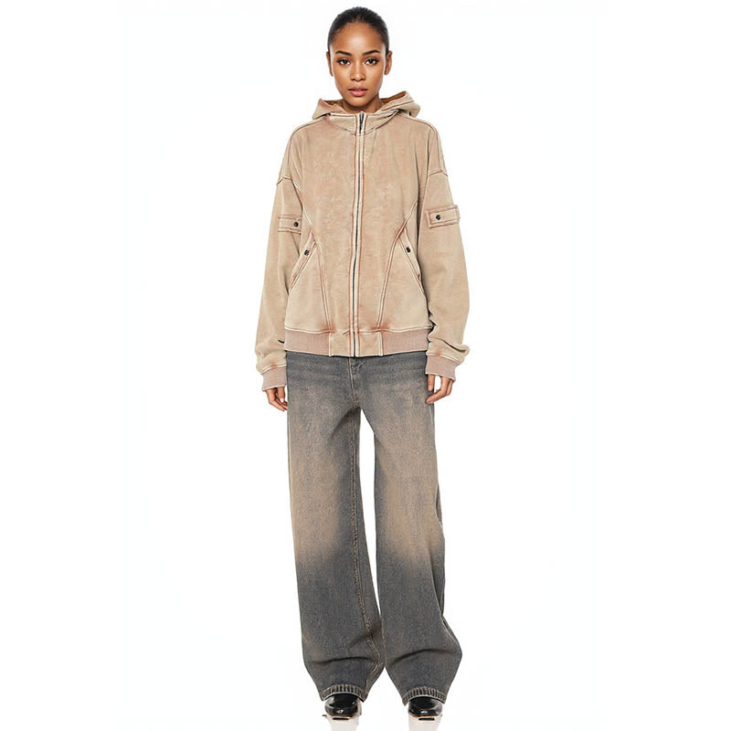 Washed distressed patch decoration plus velvet hooded cardigan sweatshirt for men and women, loose casual jacket